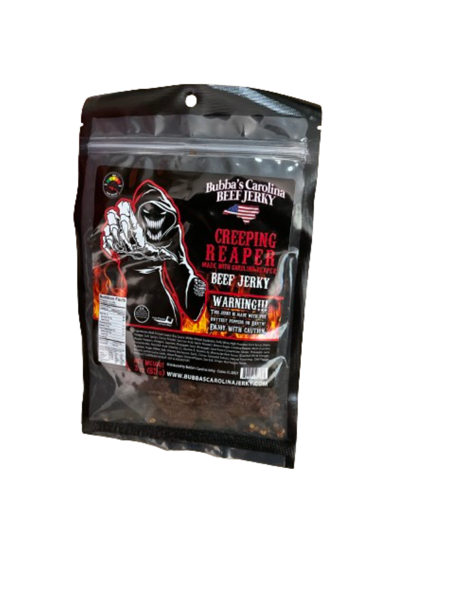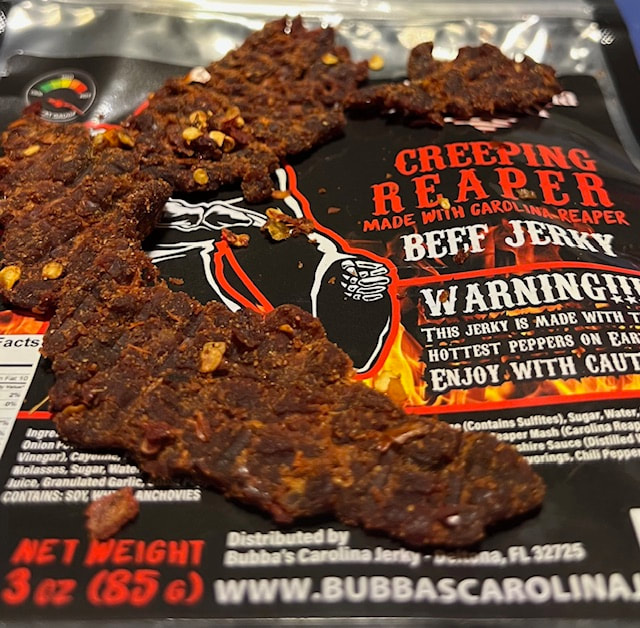 Many of you have asked for hotter, and we’ve answered. We’ve developed our latest hot jerky using the world’s hottest pepper, the Carolina Reaper. This jerky is so hot, each bag comes with a warning. And this isn’t just a marketing gimmick—it really is scorching! Be sure to have water, milk, or even a firehose nearby when you try it, because this heat is no joke!